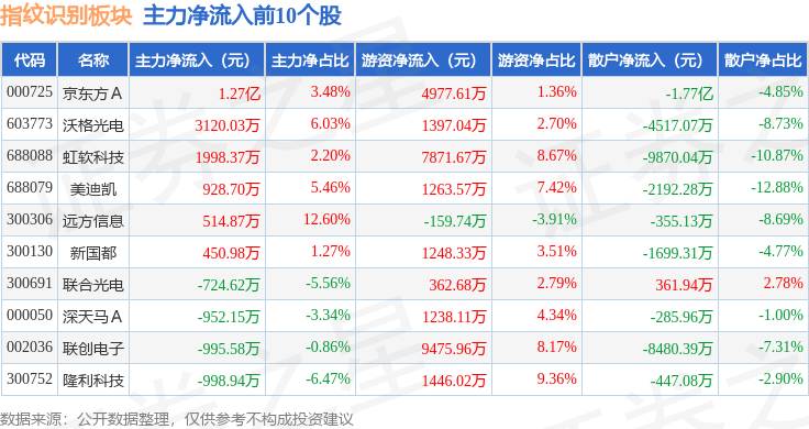 从资金流向上来看,当日指纹识别板块主力资金净流出21.87亿元,游资资金净流入8.44亿元,散户资金净流入13.43亿元。指纹识别板块个股资金流向见下表: