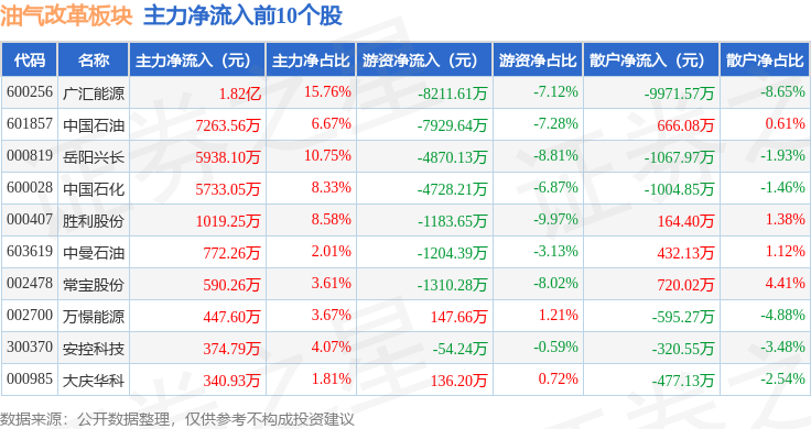 从资金流向上来看,当日油气改革板块主力资金净流出2755.66万元,游资资金净流出3.22亿元,散户资金净流入3.49亿元。油气改革板块个股资金流向见下表: