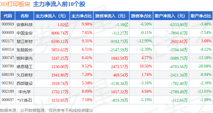 从资金流向上来看,当日3D打印板块主力资金净流出18.46亿元,游资资金净流入7.2亿元,散户资金净流入11.26亿元。3D打印板块个股资金流向见下表: