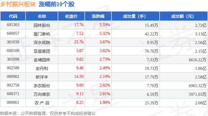 证券之星消息,10月10日乡村振兴板块较上一交易日下跌0.52%,东方园林领跌。当日上证指数报收于3897.03,下跌0.94%。深证成指报收于13355.42,下跌2.7%。乡村振兴板块个股涨跌见下表: