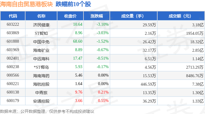 从资金流向上来看,当日海南自由贸易港板块主力资金净流出4.64亿元,游资资金净流入1.57亿元,散户资金净流入3.06亿元。海南自由贸易港板块个股资金流向见下表: