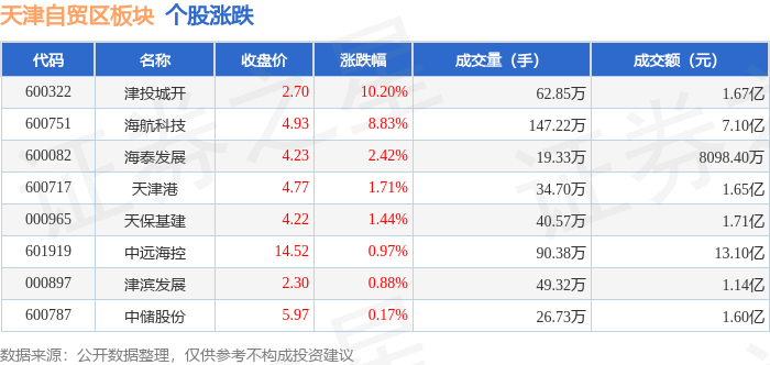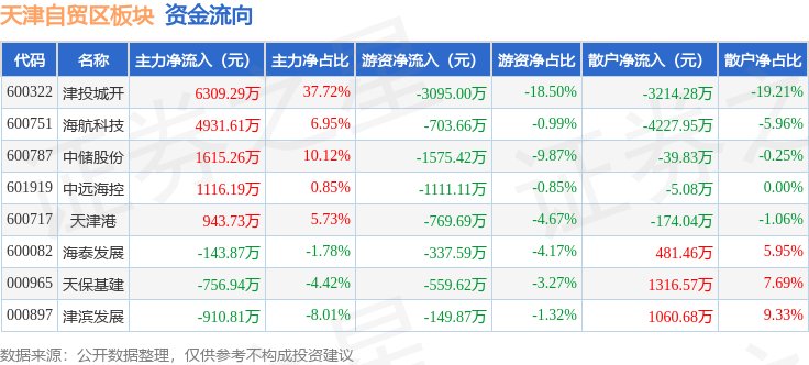 从资金流向上来看,当日天津自贸区板块主力资金净流入1.31亿元,游资资金净流出8301.99万元,散户资金净流出4802.48万元。天津自贸区板块个股资金流向见下表: