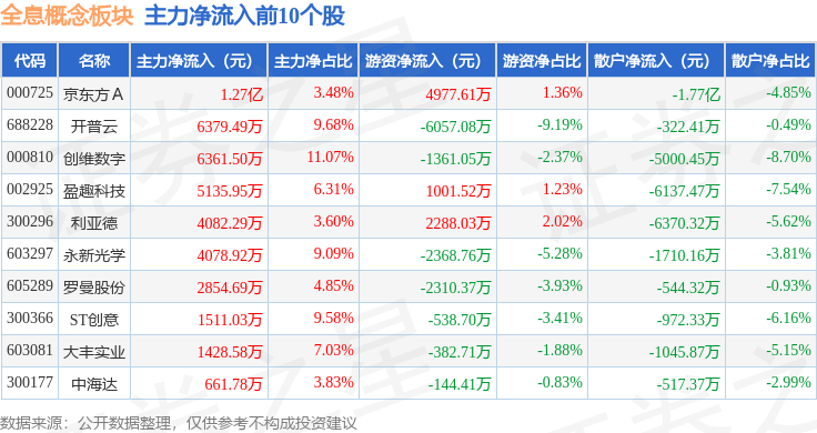 从资金流向上来看,当日全息概念板块主力资金净流出13.37亿元,游资资金净流入5.37亿元,散户资金净流入8.0亿元。全息概念板块个股资金流向见下表: