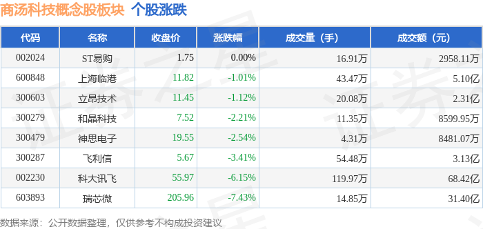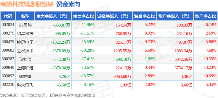 从资金流向上来看,当日商汤科技概念股板块主力资金净流出11.59亿元,游资资金净流入3.1亿元,散户资金净流入8.49亿元。商汤科技概念股板块个股资金流向见下表: