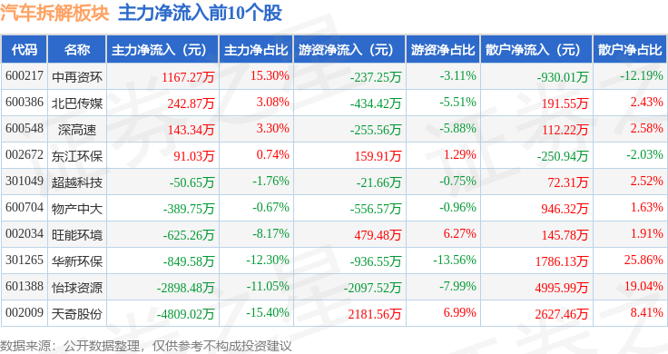 从资金流向上来看,当日汽车拆解板块主力资金净流出7.36亿元,游资资金净流入3064.9万元,散户资金净流入7.05亿元。汽车拆解板块个股资金流向见下表: