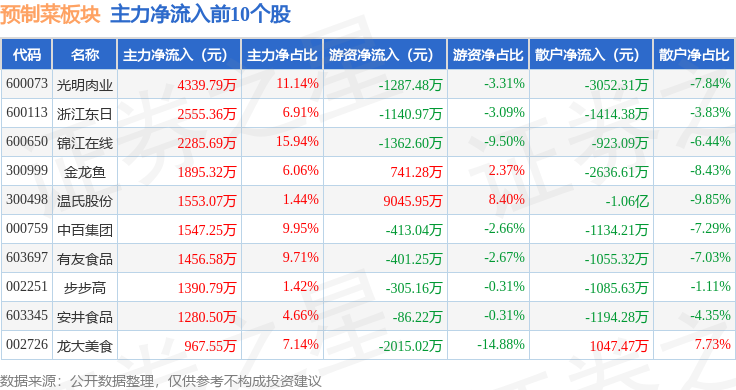 从资金流向上来看,当日预制菜板块主力资金净流出3.16亿元,游资资金净流入8486.59万元,散户资金净流入2.31亿元。预制菜板块个股资金流向见下表:
