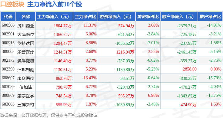 从资金流向上来看,当日口腔板块主力资金净流出9.75亿元,游资资金净流入2.61亿元,散户资金净流入7.13亿元。口腔板块个股资金流向见下表: