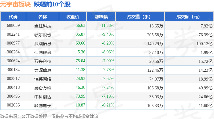 证券之星消息,10月10日元宇宙板块较上一交易日下跌4.29%,当虹科技领跌。当日上证指数报收于3897.03,下跌0.94%。深证成指报收于13355.42,下跌2.7%。元宇宙板块个股涨跌见下表: