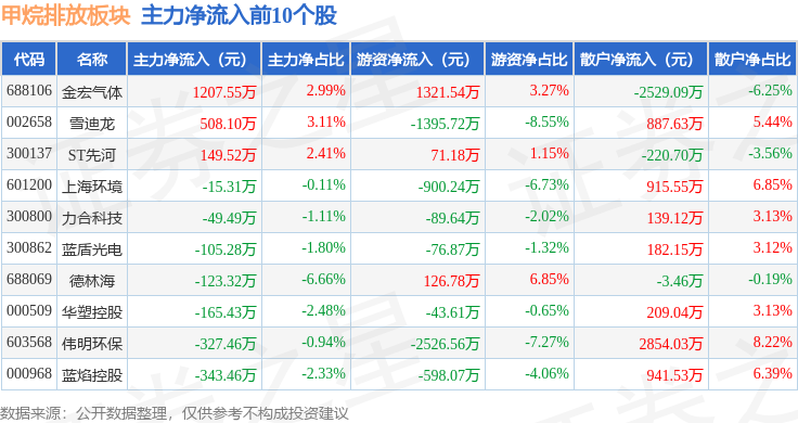 从资金流向上来看,当日甲烷排放板块主力资金净流出1.02亿元,游资资金净流出6201.09万元,散户资金净流入1.64亿元。甲烷排放板块个股资金流向见下表:
