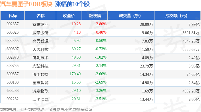 证券之星消息,10月10日汽车黑匣子EDR板块较上一交易日下跌3.74%,全志科技领跌。当日上证指数报收于3897.03,下跌0.94%。深证成指报收于13355.42,下跌2.7%。汽车黑匣子EDR板块个股涨跌见下表: