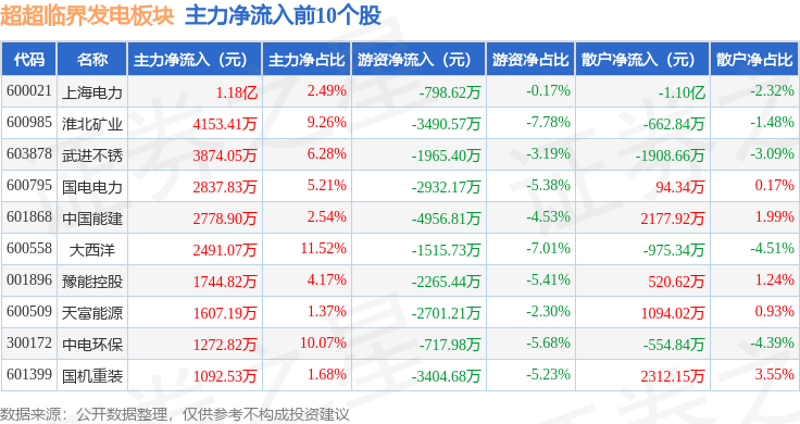 从资金流向上来看,当日超超临界发电板块主力资金净流出17.63亿元,游资资金净流出9061.27万元,散户资金净流入18.54亿元。超超临界发电板块个股资金流向见下表: