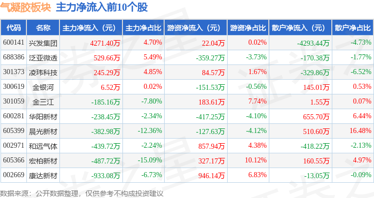 从资金流向上来看,当日气凝胶板块主力资金净流出1.68亿元,游资资金净流入1.02亿元,散户资金净流入6562.16万元。气凝胶板块个股资金流向见下表: