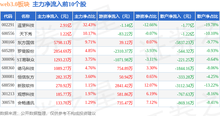 从资金流向上来看,当日web3.0板块主力资金净流出4.36亿元,游资资金净流入1.02亿元,散户资金净流入3.34亿元。web3.0板块个股资金流向见下表:
