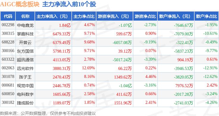 从资金流向上来看,当日AIGC概念板块主力资金净流出56.92亿元,游资资金净流入11.5亿元,散户资金净流入45.42亿元。AIGC概念板块个股资金流向见下表: