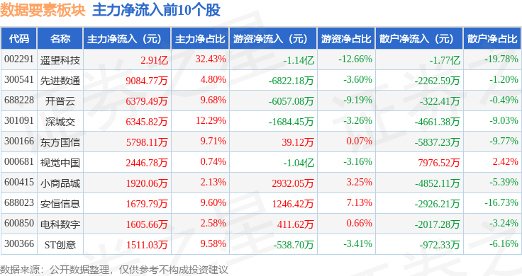 从资金流向上来看,当日数据要素板块主力资金净流出27.03亿元,游资资金净流入6.8亿元,散户资金净流入20.23亿元。数据要素板块个股资金流向见下表: