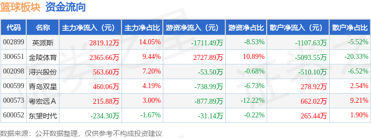 从资金流向上来看,当日篮球板块主力资金净流入6190.02万元,游资资金净流出685.12万元,散户资金净流出5504.9万元。篮球板块个股资金流向见下表: