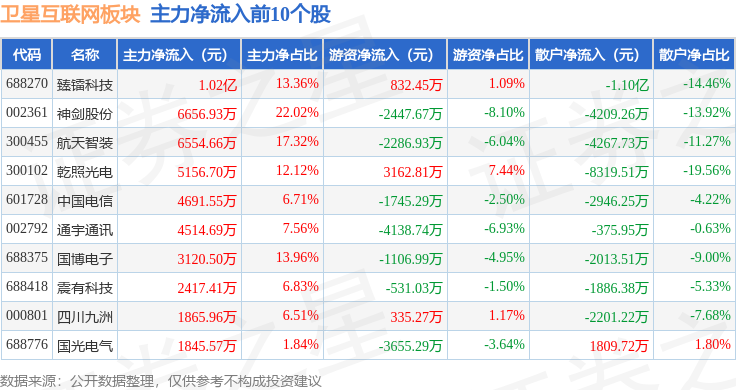 从资金流向上来看,当日卫星互联网板块主力资金净流出23.33亿元,游资资金净流入7.23亿元,散户资金净流入16.1亿元。卫星互联网板块个股资金流向见下表: