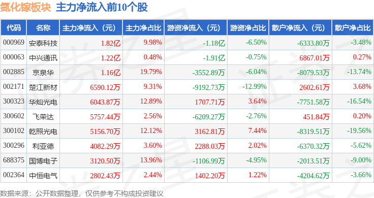 从资金流向上来看,当日氮化镓板块主力资金净流出97.67亿元,游资资金净流入30.09亿元,散户资金净流入67.58亿元。氮化镓板块个股资金流向见下表: