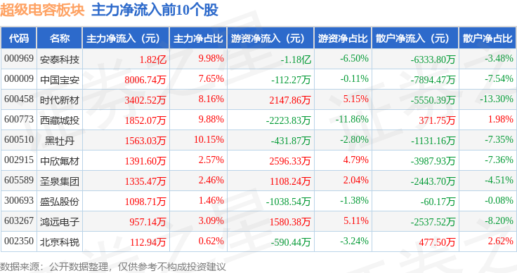 从资金流向上来看,当日超级电容板块主力资金净流出29.52亿元,游资资金净流入8.85亿元,散户资金净流入20.66亿元。超级电容板块个股资金流向见下表:
