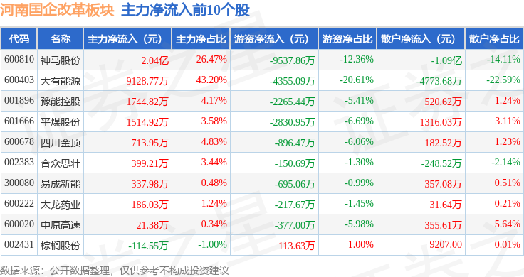 从资金流向上来看,当日河南国企改革板块主力资金净流出1.08亿元,游资资金净流出8370.9万元,散户资金净流入1.92亿元。河南国企改革板块个股资金流向见下表: