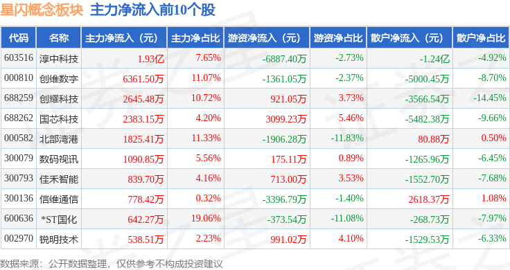 从资金流向上来看,当日星闪概念板块主力资金净流出47.31亿元,游资资金净流入14.64亿元,散户资金净流入32.66亿元。星闪概念板块个股资金流向见下表: