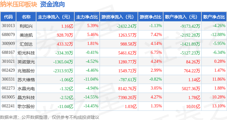 从资金流向上来看,当日纳米压印板块主力资金净流出15.04亿元,游资资金净流入3.32亿元,散户资金净流入11.73亿元。纳米压印板块个股资金流向见下表: