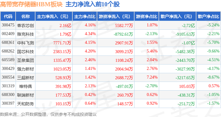 从资金流向上来看,当日高带宽存储器HBM板块主力资金净流出29.17亿元,游资资金净流入11.66亿元,散户资金净流入17.51亿元。高带宽存储器HBM板块个股资金流向见下表: