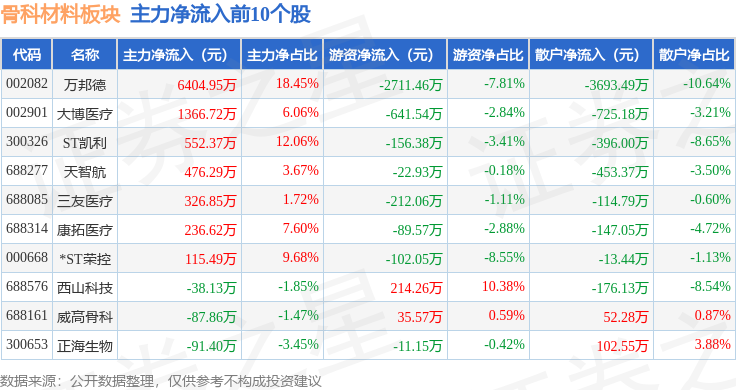 从资金流向上来看,当日骨科材料板块主力资金净流出1.75亿元,游资资金净流入2451.37万元,散户资金净流入1.5亿元。骨科材料板块个股资金流向见下表: