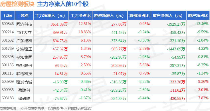 从资金流向上来看,当日房屋检测板块主力资金净流出3.34亿元,游资资金净流出6597.32万元,散户资金净流入4.0亿元。房屋检测板块个股资金流向见下表: