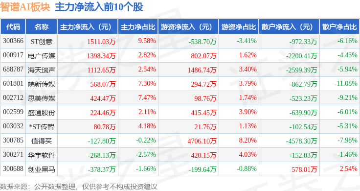 从资金流向上来看,当日智谱AI板块主力资金净流出36.46亿元,游资资金净流入9.66亿元,散户资金净流入26.8亿元。智谱AI板块个股资金流向见下表: