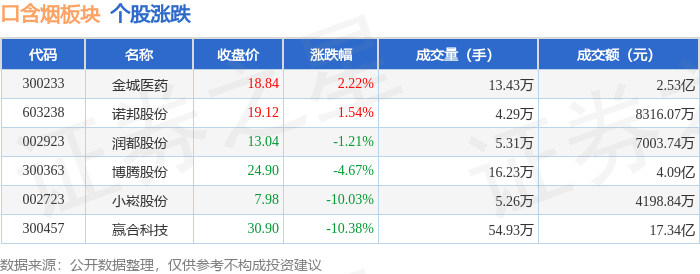 证券之星消息,10月10日口含烟板块较上一交易日下跌5.85%,赢合科技领跌。当日上证指数报收于3897.03,下跌0.94%。深证成指报收于13355.42,下跌2.7%。口含烟板块个股涨跌见下表: