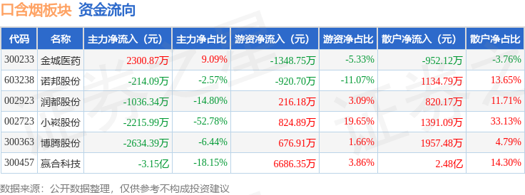 从资金流向上来看,当日口含烟板块主力资金净流出3.53亿元,游资资金净流入6134.88万元,散户资金净流入2.92亿元。口含烟板块个股资金流向见下表: