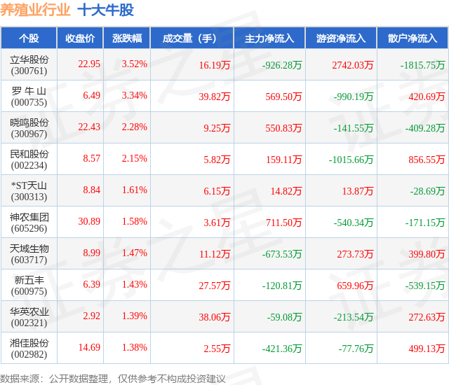 个股表现方面,养殖业行业当日领涨股为立华股份(300761),该股当日报收22.95,上涨3.52%,成交量16.19万,主力资金净流出926.28万元。罗 牛 山(000735)以上涨3.34%紧随其后,该股当日成交量39.82万,主力资金净流入569.5万元。除此之外,晓鸣股份(300967)、民和股份(002234)、*ST天山(300313)均进入当日牛股之列。具体个股列表见下表:
