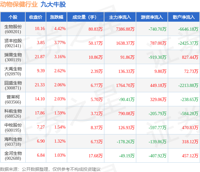 个股表现方面,动物保健行业当日领涨股为生物股份(600201),该股当日报收10.16,上涨4.42%,成交量80.83万,主力资金净流入7386.88万元。贤丰控股(002141)以上涨3.77%紧随其后,该股当日成交量50.17万,主力资金净流入1638.37万元。除此之外,瑞普生物(300119)、大禹生物(920970)、回盛生物(300871)均进入当日牛股之列。具体个股列表见下表: