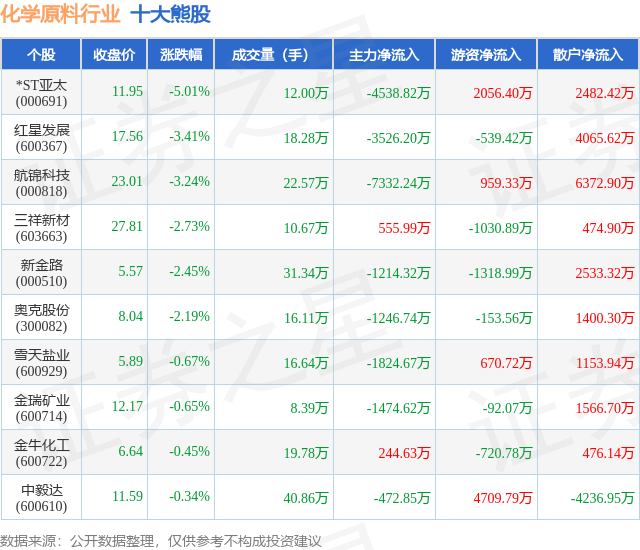 个股表现方面,化学原料行业当日领跌股为*ST亚太(000691),该股当日报收11.95,下跌5.01%,成交量12.0万,主力资金净流出4538.82万元。红星发展(600367)以下跌3.41%紧随其后,该股当日成交量18.28万,主力资金净流出3526.2万元。除此之外,航锦科技(000818)、三祥新材(603663)、新金路(000510)均进入当日熊股之列。具体个股列表见下表: