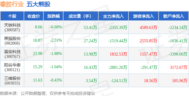 个股表现方面,橡胶行业当日领跌股为天铁科技(300587),该股当日报收8.66,下跌6.68%,成交量53.41万,主力资金净流出2355.39万元。黑猫股份(002068)以下跌2.51%紧随其后,该股当日成交量27.24万,主力资金净流出1519.44万元。除此之外,震安科技(300767)、阳谷华泰(300121)、三维股份(603033)均进入当日熊股之列。具体个股列表见下表: