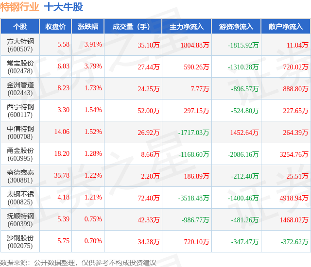 个股表现方面,特钢行业当日领涨股为方大特钢(600507),该股当日报收5.58,上涨3.91%,成交量35.1万,主力资金净流入1804.88万元。常宝股份(002478)以上涨3.79%紧随其后,该股当日成交量27.44万,主力资金净流入590.26万元。除此之外,金洲管道(002443)、西宁特钢(600117)、中信特钢(000708)均进入当日牛股之列。具体个股列表见下表:
