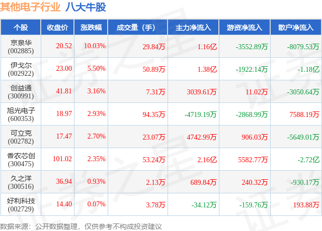 个股表现方面,其他电子行业当日领涨股为京泉华(002885),该股当日报收20.52,上涨10.03%,成交量29.84万,主力资金净流入1.16亿元。伊戈尔(002922)以上涨5.5%紧随其后,该股当日成交量50.89万,主力资金净流入1.38亿元。除此之外,创益通(300991)、旭光电子(600353)、可立克(002782)均进入当日牛股之列。具体个股列表见下表: