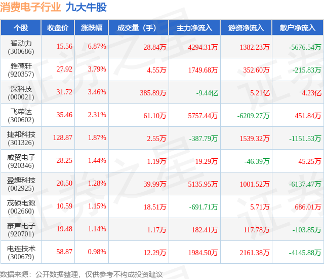 个股表现方面,消费电子行业当日领涨股为智动力(300686),该股当日报收15.56,上涨6.87%,成交量28.84万,主力资金净流入4294.31万元。雅葆轩(920357)以上涨3.79%紧随其后,该股当日成交量4.55万,主力资金净流入1749.68万元。除此之外,深科技(000021)、飞荣达(300602)、捷邦科技(301326)均进入当日牛股之列。具体个股列表见下表: