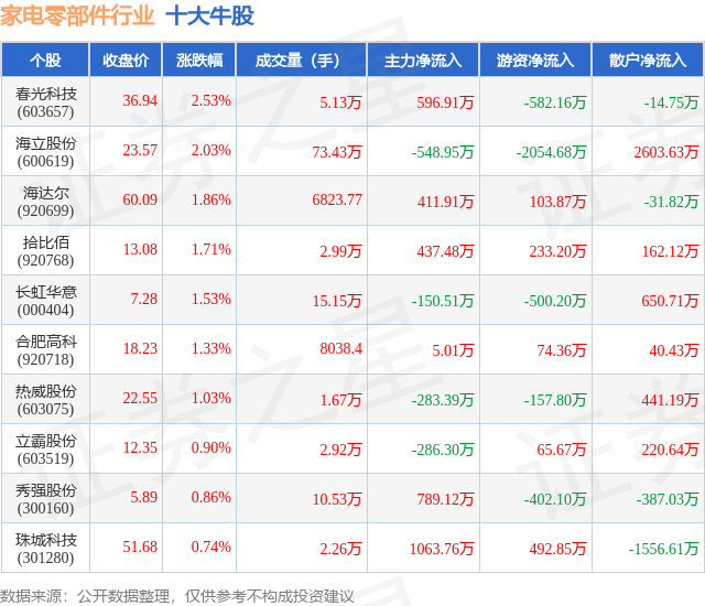 个股表现方面,家电零部件行业当日领涨股为春光科技(603657),该股当日报收36.94,上涨2.53%,成交量5.13万,主力资金净流入596.91万元。海立股份(600619)以上涨2.03%紧随其后,该股当日成交量73.43万,主力资金净流出548.95万元。除此之外,海达尔(920699)、拾比佰(920768)、长虹华意(000404)均进入当日牛股之列。具体个股列表见下表:
