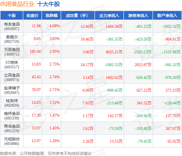 个股表现方面,休闲食品行业当日领涨股为有友食品(603697),该股当日报收11.98,上涨4.08%,成交量12.6万,主力资金净流入1456.58万元。麦趣尔(002719)以上涨3.65%紧随其后,该股当日成交量10.46万,主力资金净流出381.55万元。除此之外,万辰集团(300972)、ST绝味(603517)、立高食品(300973)均进入当日牛股之列。具体个股列表见下表: