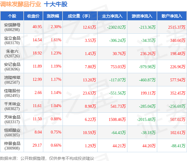 个股表现方面,调味发酵品行业当日领涨股为安琪酵母(600298),该股当日报收40.95,上涨2.3%,成交量12.61万,主力资金净流出2302.02万元。宝立食品(603170)以上涨1.61%紧随其后,该股当日成交量3.55万,主力资金净流出306.24万元。除此之外,朱老六(920726)、安记食品(603696)、涪陵榨菜(002507)均进入当日牛股之列。具体个股列表见下表:
