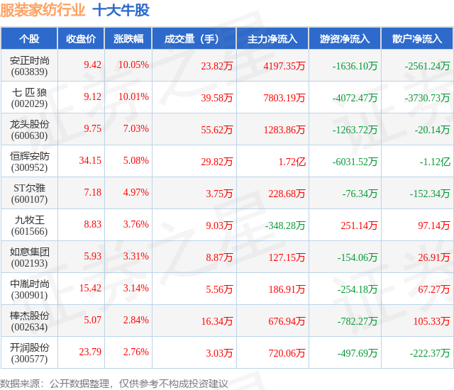 个股表现方面,服装家纺行业当日领涨股为安正时尚(603839),该股当日报收9.42,上涨10.05%,成交量23.82万,主力资金净流入4197.35万元。七 匹 狼(002029)以上涨10.01%紧随其后,该股当日成交量39.58万,主力资金净流入7803.19万元。除此之外,龙头股份(600630)、恒辉安防(300952)、ST尔雅(600107)均进入当日牛股之列。具体个股列表见下表: