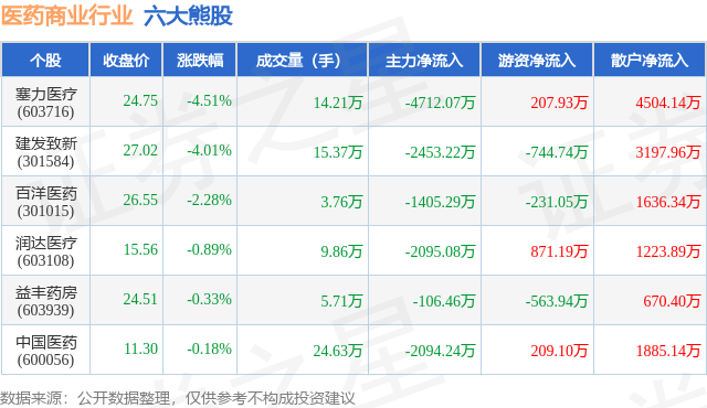 个股表现方面,医药商业行业当日领跌股为塞力医疗(603716),该股当日报收24.75,下跌4.51%,成交量14.21万,主力资金净流出4712.07万元。建发致新(301584)以下跌4.01%紧随其后,该股当日成交量15.37万,主力资金净流出2453.22万元。除此之外,百洋医药(301015)、润达医疗(603108)、益丰药房(603939)均进入当日熊股之列。具体个股列表见下表: