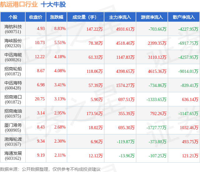 个股表现方面,航运港口行业当日领涨股为海航科技(600751),该股当日报收4.93,上涨8.83%,成交量147.22万,主力资金净流入4931.61万元。海峡股份(002320)以上涨5.51%紧随其后,该股当日成交量78.38万,主力资金净流入4518.4万元。除此之外,中远海能(600026)、招商轮船(601872)、中远海特(600428)均进入当日牛股之列。具体个股列表见下表: