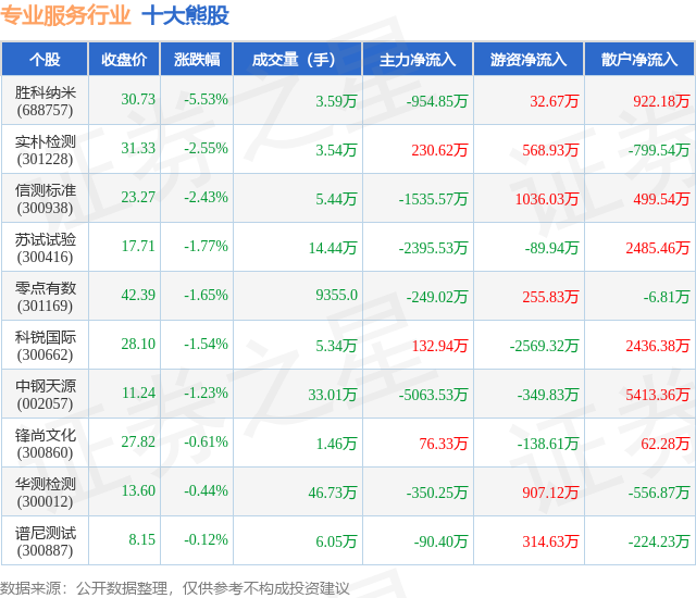 个股表现方面,专业服务行业当日领跌股为胜科纳米(688757),该股当日报收30.73,下跌5.53%,成交量3.59万,主力资金净流出954.85万元。实朴检测(301228)以下跌2.55%紧随其后,该股当日成交量3.54万,主力资金净流入230.62万元。除此之外,信测标准(300938)、苏试试验(300416)、零点有数(301169)均进入当日熊股之列。具体个股列表见下表: