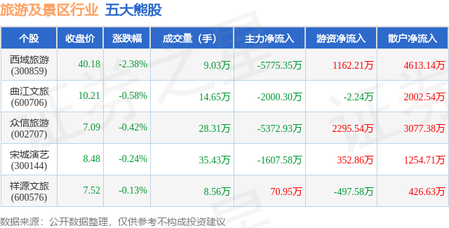 个股表现方面,旅游及景区行业当日领跌股为西域旅游(300859),该股当日报收40.18,下跌2.38%,成交量9.03万,主力资金净流出5775.35万元。曲江文旅(600706)以下跌0.58%紧随其后,该股当日成交量14.65万,主力资金净流出2000.3万元。除此之外,众信旅游(002707)、宋城演艺(300144)、祥源文旅(600576)均进入当日熊股之列。具体个股列表见下表: