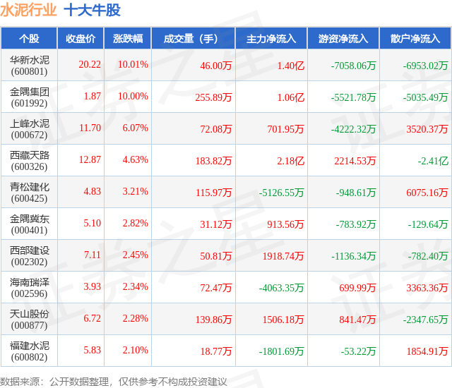 个股表现方面,水泥行业当日领涨股为华新水泥(600801),该股当日报收20.22,上涨10.01%,成交量46.0万,主力资金净流入1.4亿元。金隅集团(601992)以上涨10.0%紧随其后,该股当日成交量255.89万,主力资金净流入1.06亿元。除此之外,上峰水泥(000672)、西藏天路(600326)、青松建化(600425)均进入当日牛股之列。具体个股列表见下表: