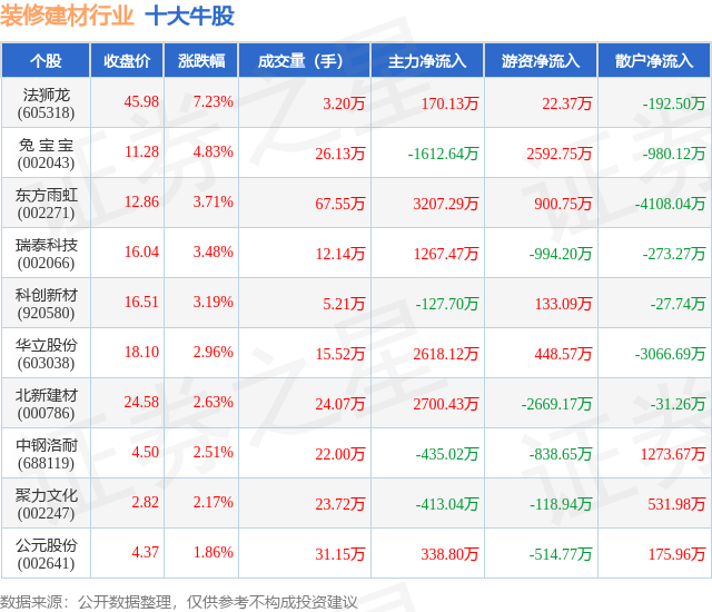 个股表现方面,装修建材行业当日领涨股为法狮龙(605318),该股当日报收45.98,上涨7.23%,成交量3.2万,主力资金净流入170.13万元。兔 宝 宝(002043)以上涨4.83%紧随其后,该股当日成交量26.13万,主力资金净流出1612.64万元。除此之外,东方雨虹(002271)、瑞泰科技(002066)、科创新材(920580)均进入当日牛股之列。具体个股列表见下表: