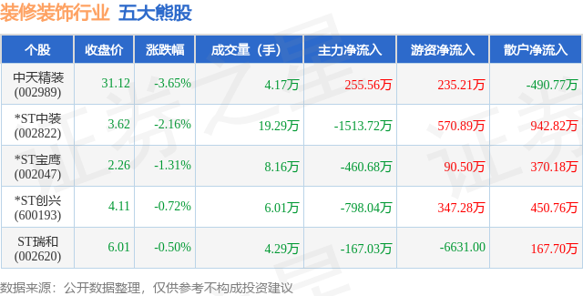 个股表现方面,装修装饰行业当日领跌股为中天精装(002989),该股当日报收31.12,下跌3.65%,成交量4.17万,主力资金净流入255.56万元。*ST中装(002822)以下跌2.16%紧随其后,该股当日成交量19.29万,主力资金净流出1513.72万元。除此之外,*ST宝鹰(002047)、*ST创兴(600193)、ST瑞和(002620)均进入当日熊股之列。具体个股列表见下表: